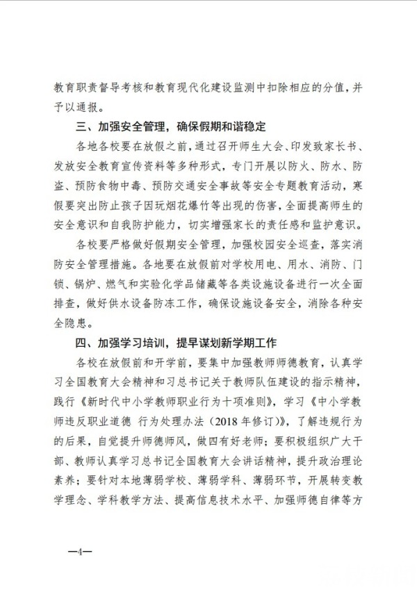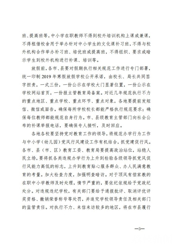 各地各校严禁在寒假期间组织学生进行集体补课、上新课或以各种名目举办文化课补习班、培优班、提高班等,中小学在职教师不得到校外培训机构上课或兼课,不得租借校舍用于举办针对中小学生的文化课补习班,不得与校外机构合作举办补习班、培优班或提高班,不得组织、要求或暗示学生到校外机构进行补课、培训等。