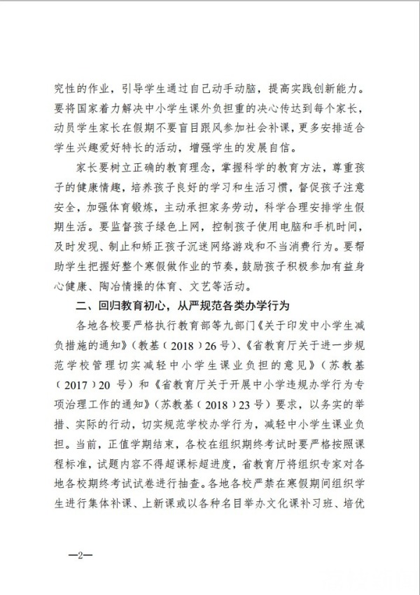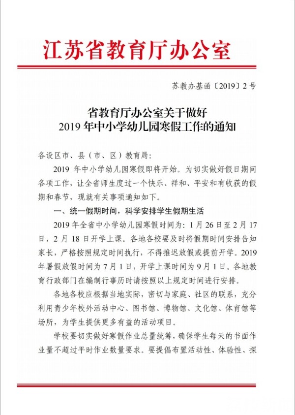 1月8日,江苏省教育厅发布通知,要求做好中小学幼儿园寒假工作,严禁寒假补课。