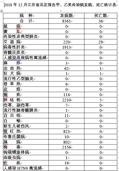 2018年12月1日0时至12月31日24时,全省共报告甲、乙类法定报告传染病发病8361例,死亡36人;本月除鼠疫、霍乱、传染性非典型肺炎、脊髓灰质炎、人感染高致病性禽流感、乙型脑炎、炭疽、白喉、钩端螺旋体病、人感染H7N9禽流感无发病报告外,其余18种甲、乙类传染病均有病例报告。报告发病数居前五位的病种为:肺结核、梅毒、肝炎、猩红热、淋病,占报告发病总数的94.53%。报告死亡数居前三位的病种为:艾滋病、肺结核、狂犬病和出血热,占报告死亡总数的100%。