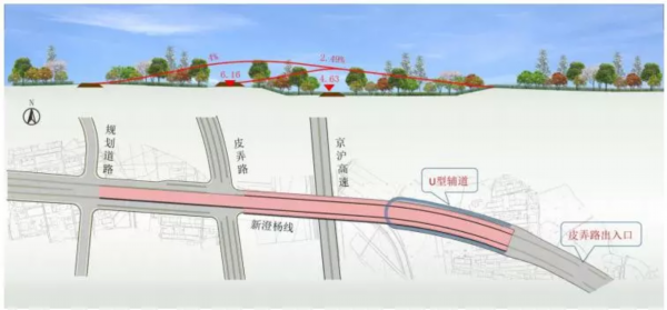 主线从大桥南路东出地面,中间采用桥梁连续跨越京沪高速和皮弄路,辅道与皮弄路平交。