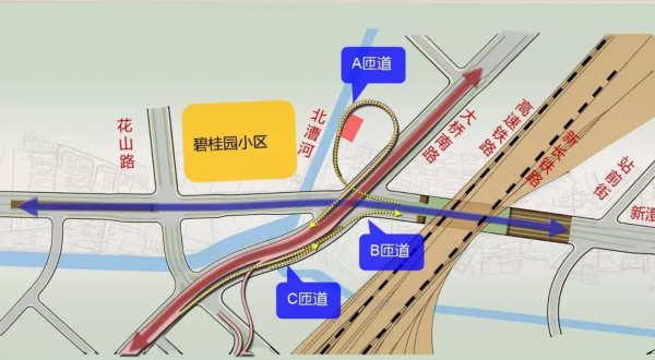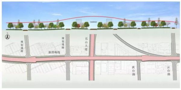 ◎继续向南经高铁站区采用高架快速化,高架连续上跨新澄杨路、花山路、西桥路及虹桥路,与新澄杨路主线隧道、高铁站落客平台设置立交;