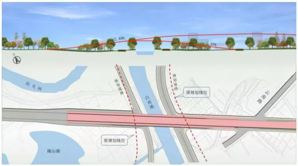 根据总体方案,主线连续跨两条规划道路、白屈港和云南路,与云亭区高架快速路主线衔接;辅道跨两条规划道路、白屈港后与云南路平交。