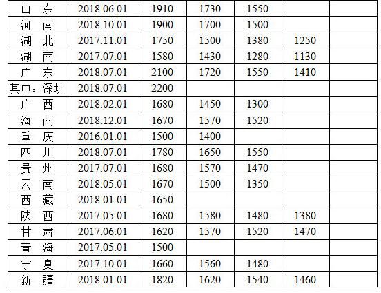 全国各地区月最低工资标准情况(截至2018年12月)