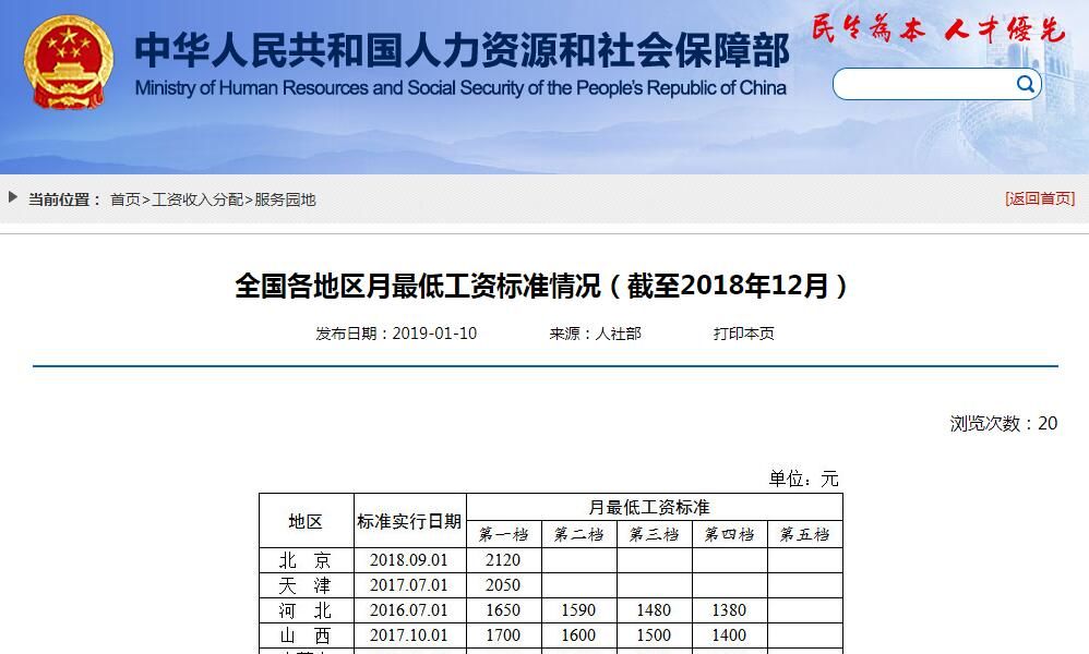 人社部10日公布全国各地区月最低工资标准情况(截至2018年12月),其中,上海月最低工资标准达到2420元,为全国最高。上海、广东、北京、天津、江苏、浙江这6个省份月最低工资标准超过2000元。你的家乡排第几?你的月工资比最低工资高多少?