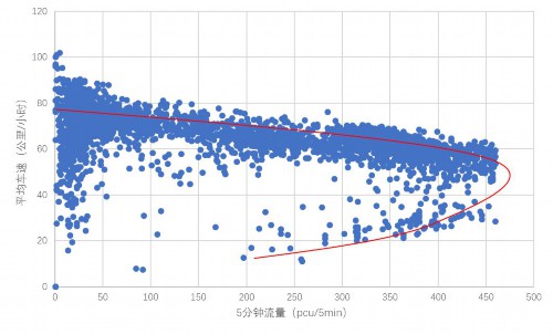 根据内环快速路区间测速抓拍的连续一个月交通量和车速数据,根据5分钟间隔的流量与平均车速的关系图,可以看出交通流量与车速之间是一个凹抛物型关系。当交通量从零开始逐步增加,快速路的平均车速逐步下降,当单向交通量达到约450标准车/5min(约5400标准车/小时,即达到强制流等级)后,随着驶入车辆进一步增加,车速则表现出急剧下降并趋于停车,交通流量呈现不增反降的态势,并随着车辆的进一步驶入快速下降。