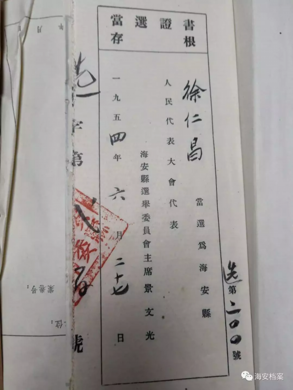▲海安县人民代表大会代表当选证书存根。