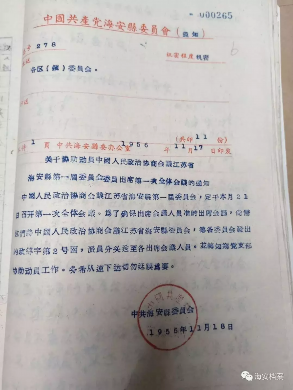 1956年11月20日至22日,政协海安县第一届委员会在海安镇举行第一次全体会议,宣告政协海安县委员会成立。