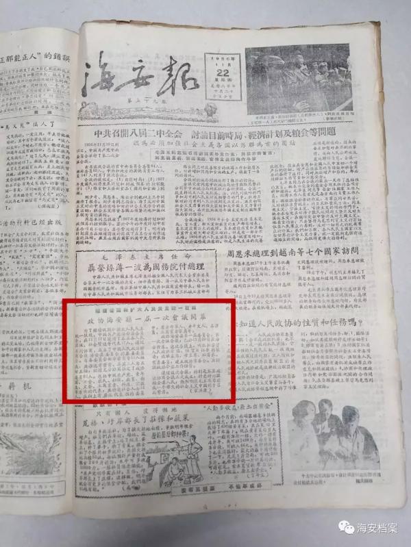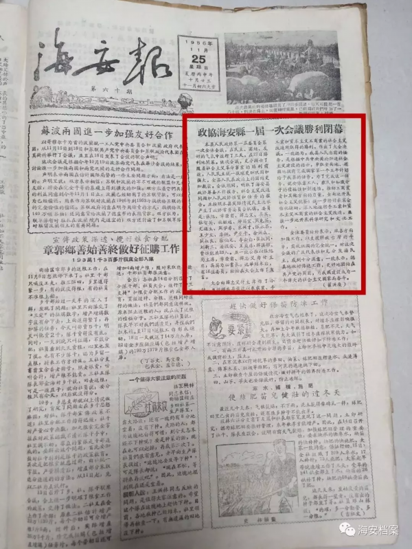 ▲《海安报》报道政协海安县第一届委员会第一次会议开幕。