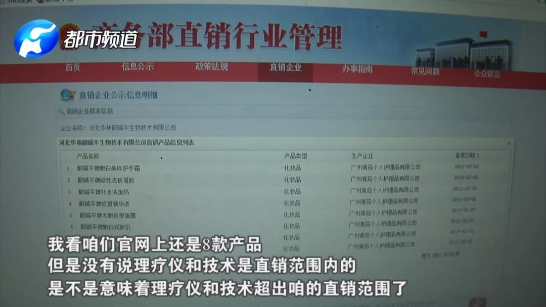 但记者从官网上发现,华林被批准直销的只有8种产品,并不包含酸碱平理疗技术。