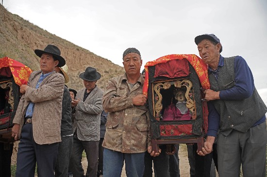 这几天,张文德在庙里只看看香火、清扫一下抬神用的轿子;张文清则在家里哪也没去,他说“神唱戏唱,都是惹人的地方”。神唱就是念经,戏唱就是唱戏,跪拜的男人队伍沿着山脊长蛇摆尾了几百米。