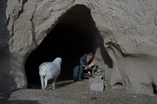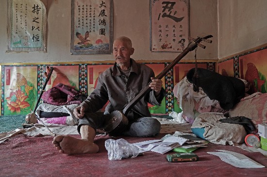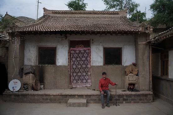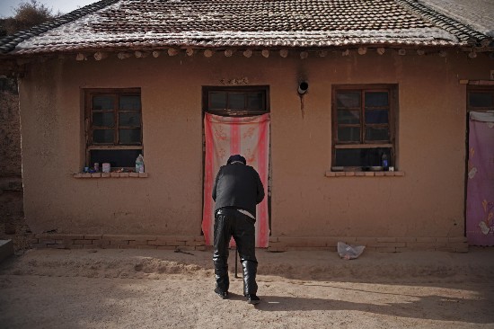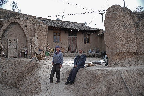 老汉周克俭的家在一条相对宽阔的沟壑底部,土房危破。屋子正中的墙上一副“顶天立地”寿联,炕墙上挂着板胡、三弦和一堆人生格言,内容包括忍、大展宏图、持之以恒、腾飞之类。