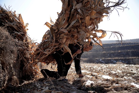 2018年12月1日,张文德从庙里回来帮大哥张文清背玉米秆,张文德单腿跪地一只手拽着绳子扣到肩膀上,另一只手撑在地上,整个人吃力地缓慢爬起来。
