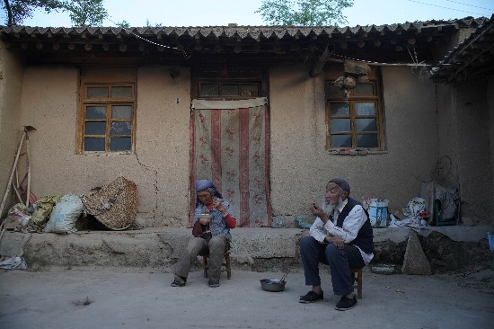 老妇喂鸡喂狗、下地干活、做晚饭。她会蒸一锅开花馍馍,黯黑的厨房雾气腾腾。老汉拿了搪瓷盆,从大缸里夹出腌萝卜丝和一坨油肉结冻的臊子,在炉火上搅拌加热,再撒点盐。一天就吃两顿,看了新闻联播,外面黑了就睡了。