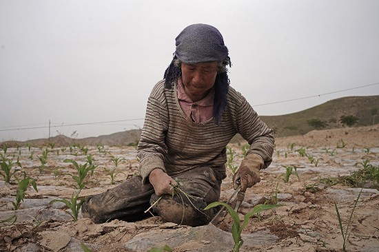 2018年5月27日,蔡焦英在地膜覆盖的玉米地里用小铲子把草钩出来,这些草很生猛,除掉又长,所以她一整天都跪在地里想彻底斩草除根。