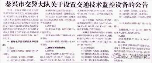 为进一步强化道路交通安全管理,切实维护我市安全、畅通的交通环境,预防重特大交通事故,根据《中华人民共和国道路交通安全法》、《道路交通安全违法行为处理程序规定》和公安厅《江苏省道路交通技术监控设备管理规定》的要求,结合泰兴市道路交通安全管理工作的实际,我市将在部分路段安装交通技术监控设备。现公示如下: