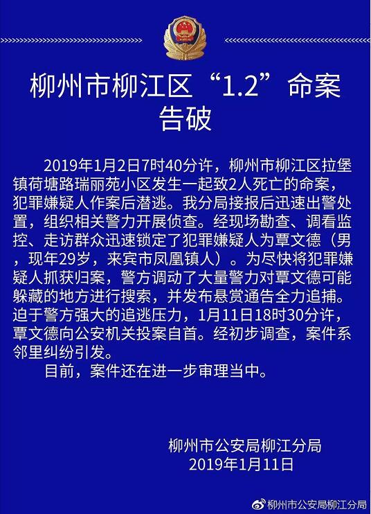 据广西柳州市公安局柳江分局1月11日22时许通报,2019年1月2日7时40分许,柳江区拉堡镇荷塘路瑞丽苑小区发生一起致2人死亡的命案,犯罪嫌疑人作案后潜逃。