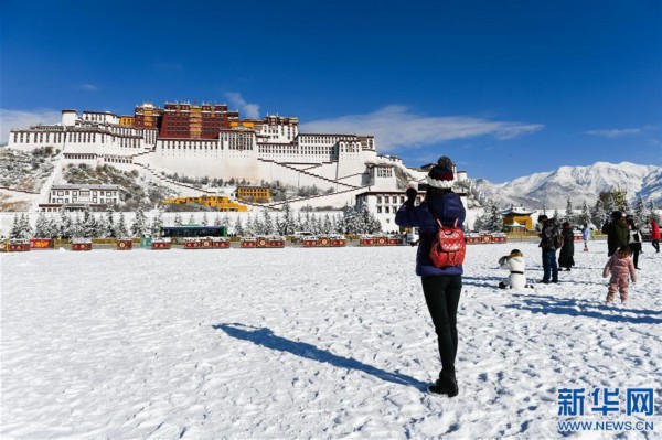 一名游客在布达拉宫广场上拍摄雪景(2018年12月19日摄)。新华社记者 刘东君 摄