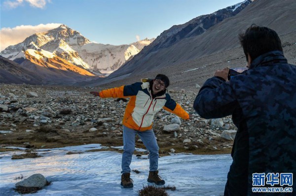 游客在珠峰脚下拍照留念(2018年12月8日摄)。新华社记者 张汝锋 摄