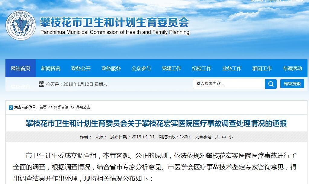 攀枝花市卫生计生委成立调查组,本着客观、公正的原则,依法依规对攀枝花宏实医院医疗事故进行了全面的调查,根据调查情况,结合省市专家分析意见、市医学会医疗事故技术鉴定专家咨询意见,得出调查结果并作出处理,现将相关情况公布如下: