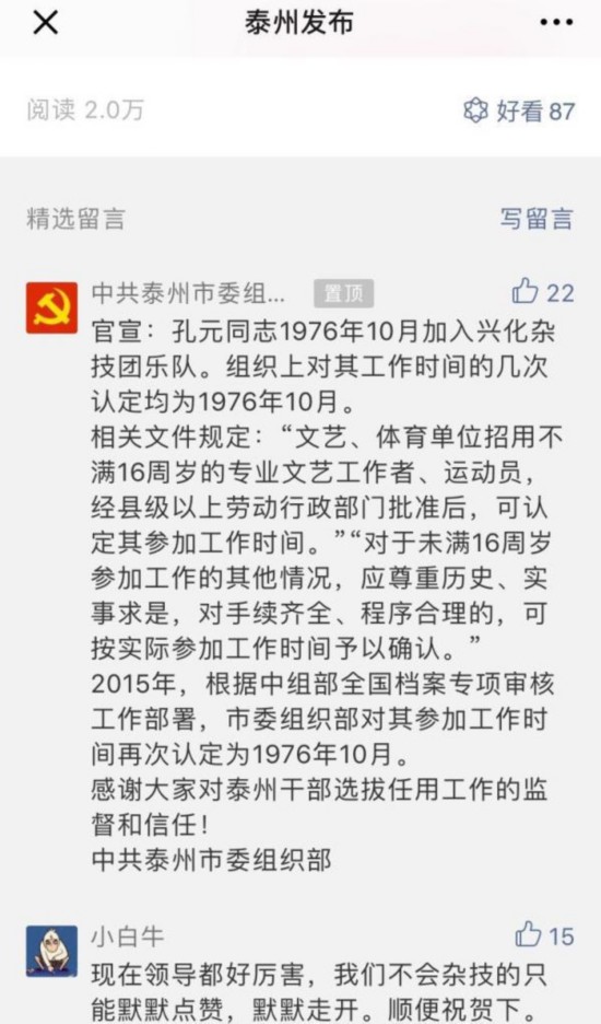 目前,泰州市委组织部的这一官方回应,已被“泰州发布”微信号在精选留言区置顶。