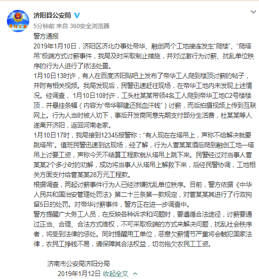 新京报快讯 据山东省济南市济阳县公安局官方微博消息,2019年1月10日,济阳区济北办事处帝华、融创两个工地接连发生“爬楼”、“爬塔吊”极端方式讨薪事件,公安局及时采取制止措施,并对过激行为讨薪、扰乱单位秩序的行为人进行了依法处置。
