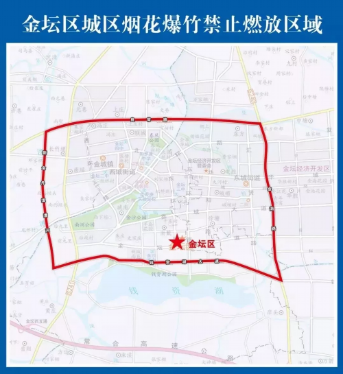 钱资湖大道以北、良常路以南、新丹金溧漕河以东、金湖路以西所形成的区域。在上述禁放区域内,全年禁止任何单位和个人燃放烟花爆竹。