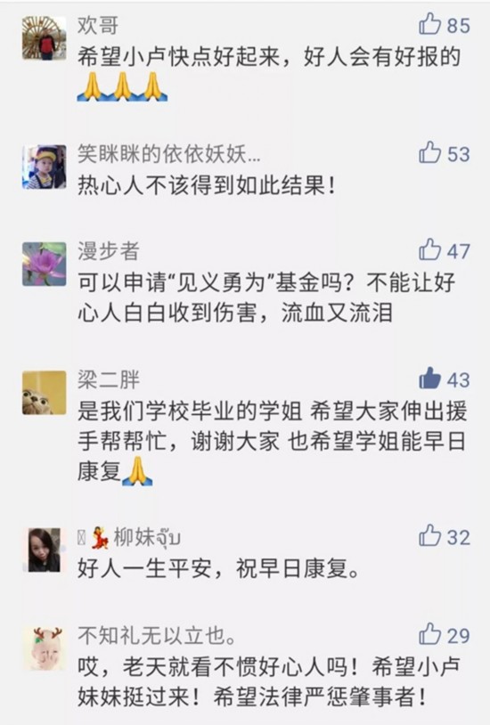 “下着雨的清晨,老人倒地的身影是那么无助。坐车途经的她,却二话不说,下车上前。披向老人的外套,带着关爱和温暖,却因为天降横祸,鲜血淋淋。女孩毫不犹豫的善举,让我们不由得心生敬意。家人那句‘无怨无悔’,更是让我们在心痛之余满怀感动。
