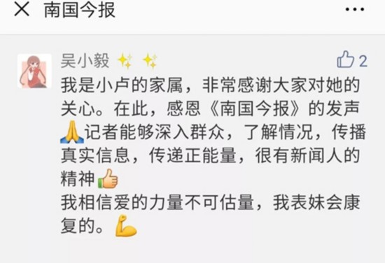 早前小卢的亲属也通过今报公众号回应网友关心。