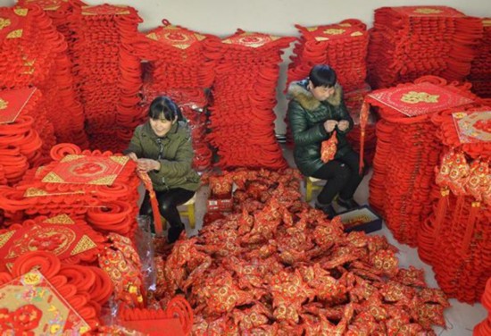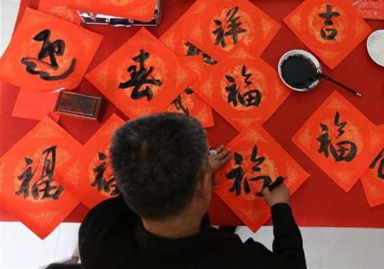 书画爱好者写春联、送福字、画年画喜庆祥和迎春节