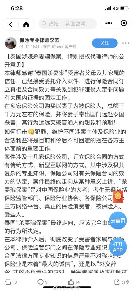今天上午受害人在国内的代理律师李斌微博发布公开意见称,目前已经接受委托介入案件,进行保险合同订立真相及合同效力等关系到犯罪嫌疑人定罪问题有关国内证据的固定工作。案件涉及十几家保险公司,订立保险合同的方式有传统方式、新型互联网的方式,案件涉及保险总额达三千万左右。