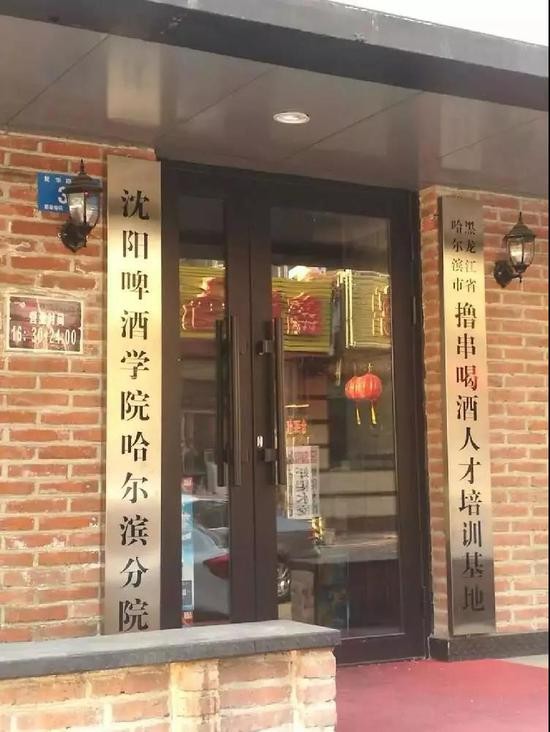 记者观察发现这是一个临街的店铺,门脸上挂着“XX鱼头和小串”的大牌匾,而门两侧各挂起一块竖匾,右侧牌匾写着“黑龙江省哈尔滨市撸串喝酒人才培训基地”,左侧牌匾则写着“沈阳啤酒学院哈尔滨分院”。乍一看,还以为是政府机关或者什么培训机构。