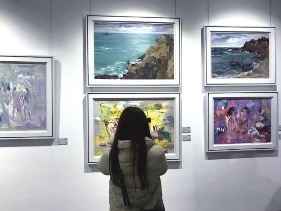 在此次展出的画作中,汪明强不仅描绘了大海、天空、码头,还有忙碌的渔夫和悠闲的游客,画面圆融温顺、韵律柔和、抒情写意。