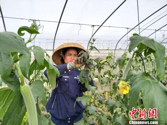 当地贫困户朱丽月打理农庄果蔬。张茜翼 摄