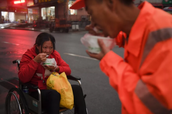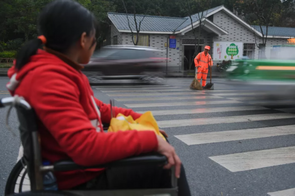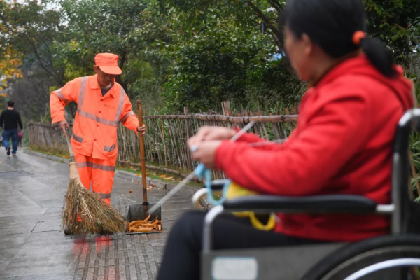 在福建省龙岩市新罗区,董锦香坐着轮椅陪丈夫董基东扫马路。