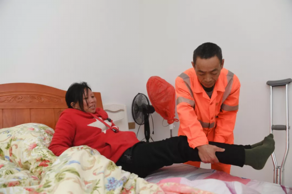 1月9日,在工作间隙,董基东给在一旁的董锦香放松腿部。