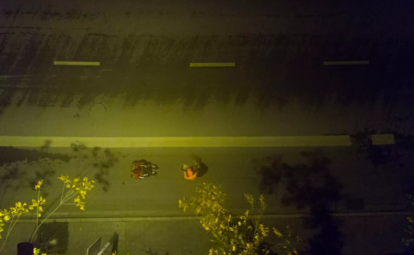 1月10日,董锦香(左)坐着轮椅陪丈夫董基东清扫路面(无人机拍摄)。
