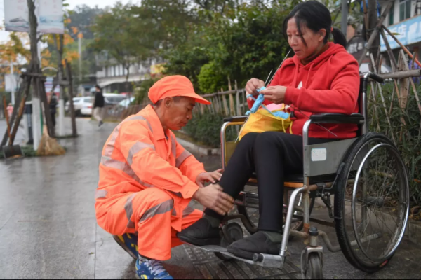 1月9日,董锦香坐着轮椅一边织毛衣,一边陪丈夫董基东清扫路面。
