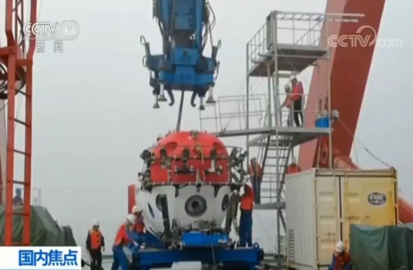 现在是当地时间早上7:30,潜水器已经起吊,随时准备下潜。