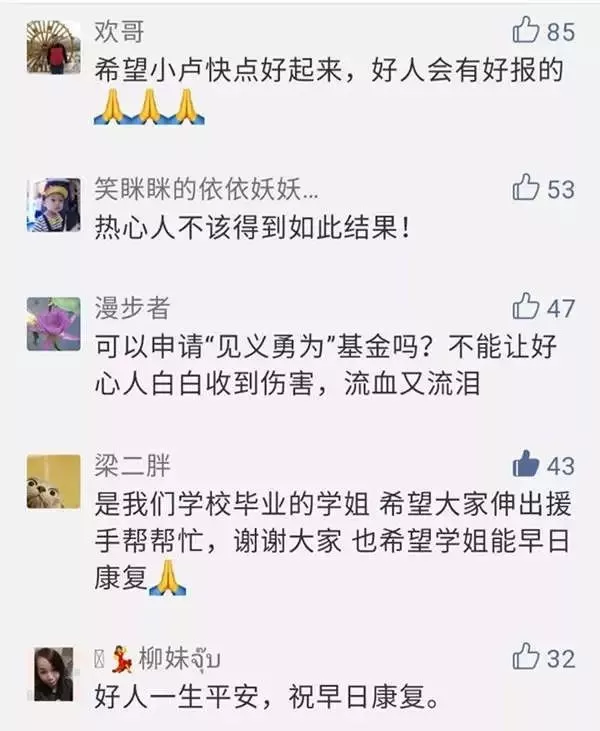 我在柳州读书,31号那天我们全宿舍的人都去捐血了,那天捐血屋里的人都是为这个女生来的。捐血的人并不认识这个女生,她们只知道,她是为救老人受伤的,真心希望她能好起来。