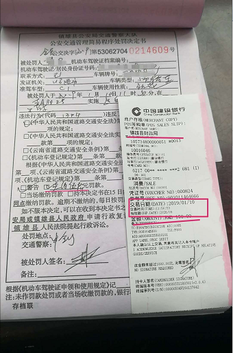 警方开具罚单和银行卡缴纳记录。图片来源:警方供图