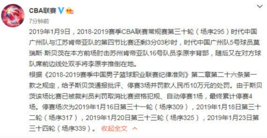 2019年1月9日,2018-2019赛季CBA联赛常规赛第三十轮(场序295)时代中国广州队与江苏肯帝亚队的第四节比赛还剩3分03秒时,时代中国广州队5号球员莫瑞斯斯贝茨在本方前场肘击苏州肯帝亚队16号队员李原宇背部,随后又在对方球队席前边线处双手将李原宇推倒在地。