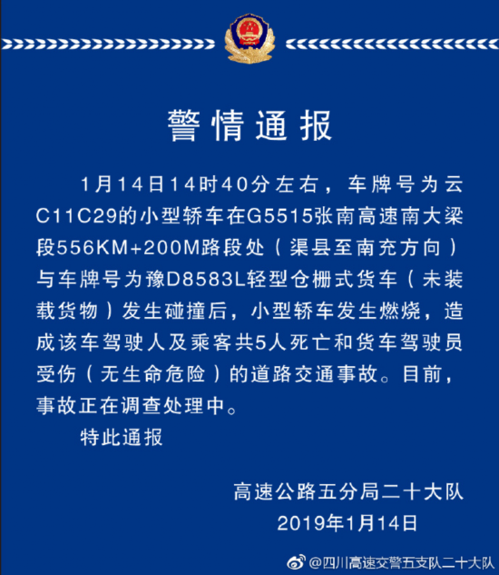 新京报快讯 据四川省公安厅交警总队高速公路五支队二十大队官方微博,1月14日14时40分左右,车牌号为云C11C29的小型轿车在G5515张南高速南大梁段556KM+200M路段处(渠县至南充方向)与车牌号为豫D8583L轻型仓栅式货车(未装载货物)发生碰撞后,小型轿车发生燃烧,造成该车驾驶人及乘客共5人死亡和货车驾驶员受伤(无生命危险)的道路交通事故。目前,事故正在调查处理中。