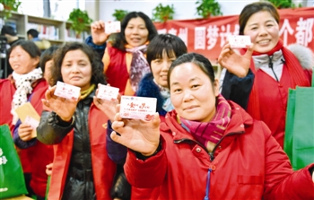 1月11日,海陵区后街背巷的环卫工人高兴地领取体检卡和防寒用品。当日,市城管局、市中医院及大爱泰州公益联盟等相关部门、单位及爱心机构在关帝庙城市港湾开展“大爱泰州 圆梦计划”——“一个都不能少”爱心公益活动。 (来源:泰州网 编辑:陈茜)