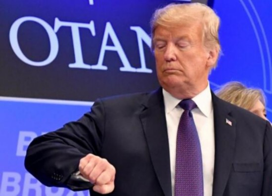 2018年7月11日,特朗普在北约峰会期间看时间。(图源:路透社)