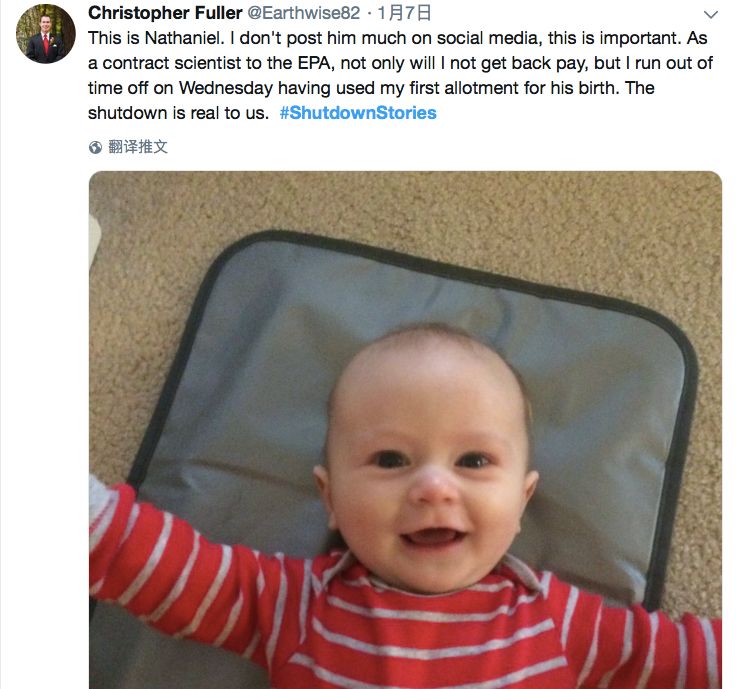 美国环境保护署的一位科学家这样说:这是Nathaniel,我刚出生的孩子。我很少在社交媒体上贴出他的照片。我是环境保护署的一名合同工,做科研工作。但是我现在不仅没有拿回我的工资,而且连养孩子的钱都入不敷出。政府关门给我们的生活带来的问题,太具体了。