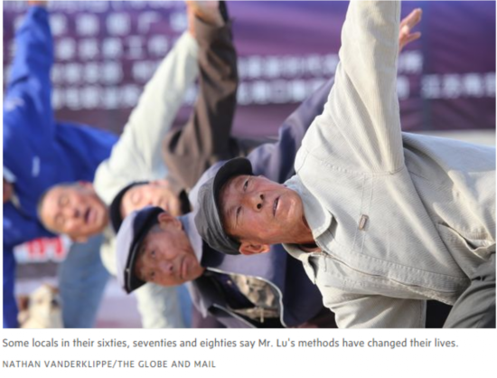 报道称,玉狗梁村地处张家口市张北县,地理位置较偏,属于贫困村。村里仅有100来名常住居民,而且大部分都是些老人家。但是一大清早,就有30多人裹着外套、迎着初升的太阳来到村广场。他们在广场上集合,沿着广场四周排成队,然后做起了瑜伽——屈膝下蹲、伸出手臂,站在砖块上保持平衡。大部分人每天要练两次,每次一个小时。
