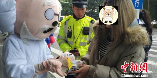 为了更好得宣传“车让人人快行”文明交通理念,在开具罚单之后,由志愿者扮演的“慢羊羊”给“低头族”赠送了一只“慢羊羊”,教育其下次快行通过斑马线;2名志愿者打扮成“闪电侠”,给快行通过斑马线的小朋友和家长赠送喜羊羊,“点赞”他们的行为。
