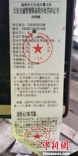 温州首张在斑马线上看手机被处罚的罚单李立摄