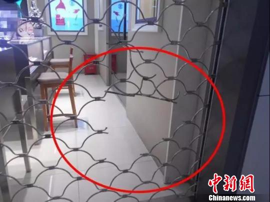 图为卷闸门上被剪了个大窟窿。嘉兴警方供图摄