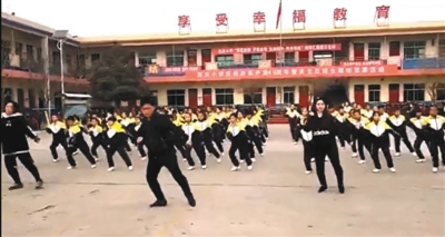 张鹏飞:我们学校其实是个农村小学,地方很小,有16个教学班,在校生734人。因为学校很小占地面积不大,也没有操场,所以不太适合传统的田径运动。除了“鬼步舞”,我们还会安排武术操。